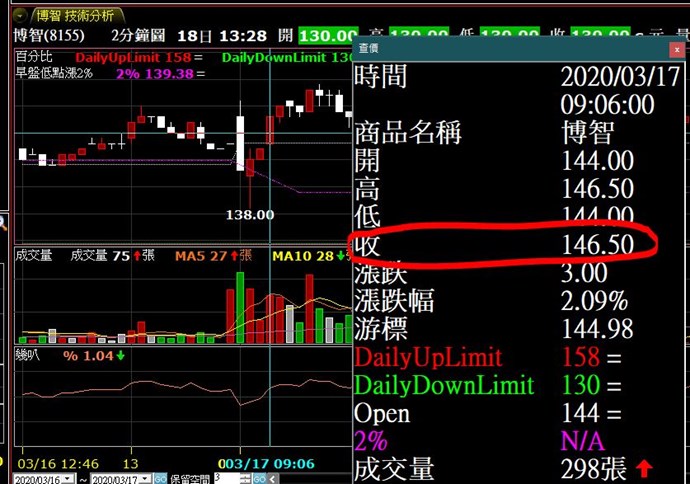 去比對博智當時的成交值,發現在09:07:46 ~ 09:08:11 之間的成交值都是146.5,意思說,使用者預期的值應該是146.5