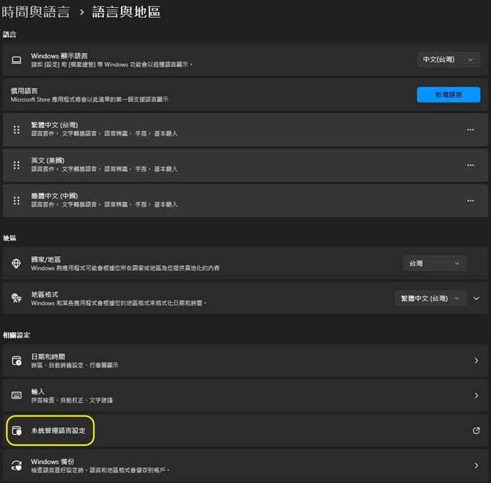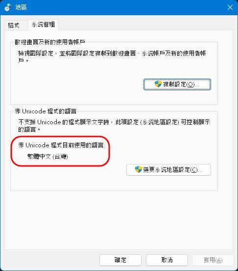 2.有按照討論區XQ官方建議檢查:設定/時間與語言/語言與地區/系統管理語言設定/系統管理/非Unicode程式的語言,此處確定是選擇【繁體中文(台灣)】