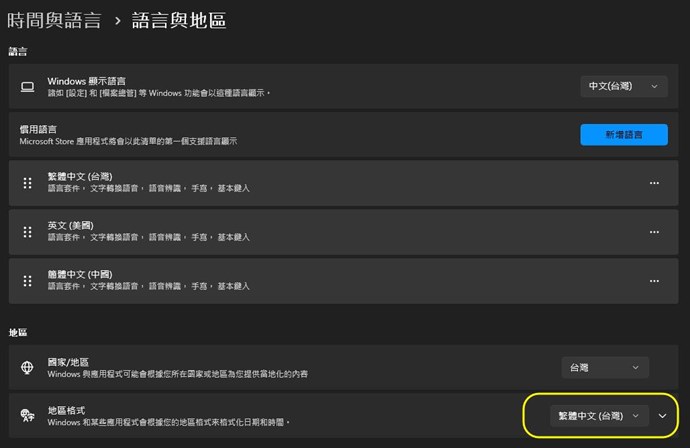 3.找到過去網路資料,發現問題可能在:設定/時間與語言/語言與地區/地區格式 這裡,原先設定是【英文(美國)】,這邊改為【繁體中文(台灣)】。