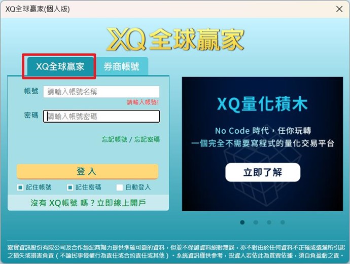 您好,XQ全球贏家(個人版)為免費註冊使用,申請帳號與密碼就可以立即使用(此為XQ帳號,可使用模擬下單,如下圖)。