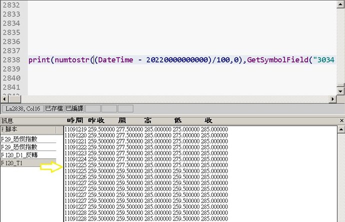 print(numtostr((DateTime - 20220000000000)/100,0),GetSymbolField("3034.TW","RefPrice","D"),GetSymbolField("3034.TW","Open","D"),GetSymbolField("3034.TW","High","D"),GetSymbolField("3034.TW","Low","D"),GetSymbolField("3034.TW","Close","D"));