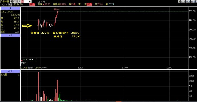 說明:聯詠3034今日漲停,但是當日震幅計算值得出過大才發現(當日最低價在11:25分顯示259.5應該是275.0才對),開盤價11:25以後也不正確(如附圖),不知道是漲停關係造成?請小幫手修正以防未來其它資料錯誤再發生