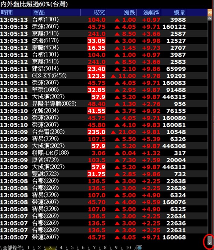 您好,即時選股會依觸發時間排序,拉到頁面最下方會是當天開盤後符合選股條件的商品。