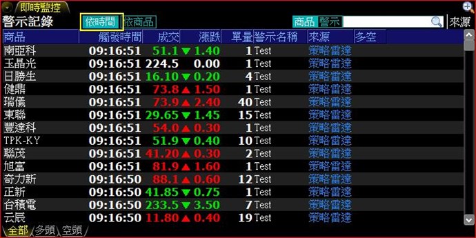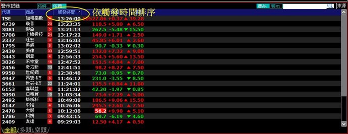 我的自設頁面其中一個欄框設定為策略雷達的[警示紀錄],停留在上方[依商品]的頁籤,並以[觸發時間]欄位做排序,如下面截圖所示,