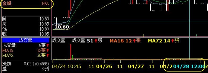 程式碼:plot1(average(GetField("成交金額","D")[1],3),"金額"); //近兩日的會顯示不出來