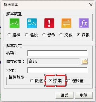 新增函數腳本時,在『新增腳本』視窗的最下方,請不要用預設的數值,而應改成字串。