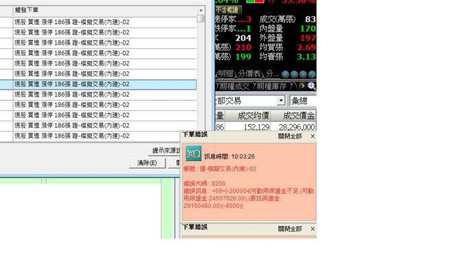 小幫手您好,我在模擬系統模擬做空單,達成平倉條件觸發送出平倉單,可是系統始終無法平倉,一直跳出"可動用保證金不足"警示訊息。