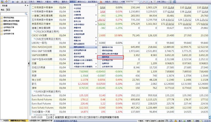 您好,目前XQ提供daily的的國際期貨近月商品報價功能有「資訊/國際金融資訊/國際期貨」,只有挑選部份項目。