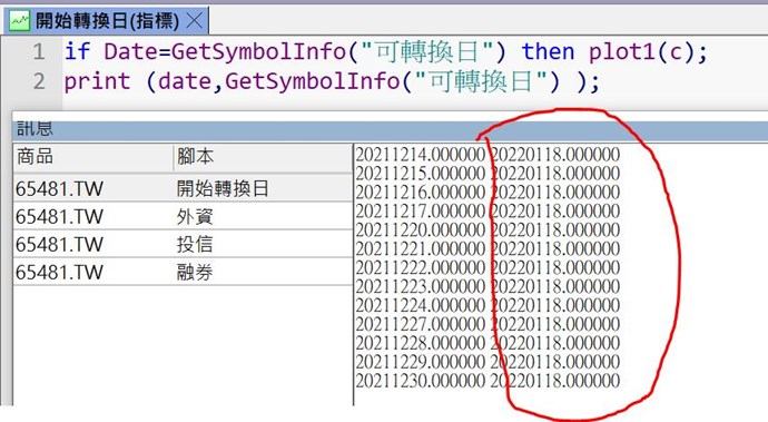 如圖, 可轉換日應該是2021/10/20, 但用 GetSymbolInfo("可轉換日"), 得到的日期是2022/1/18, 它是到期日(下市日), 為何會如此呢?