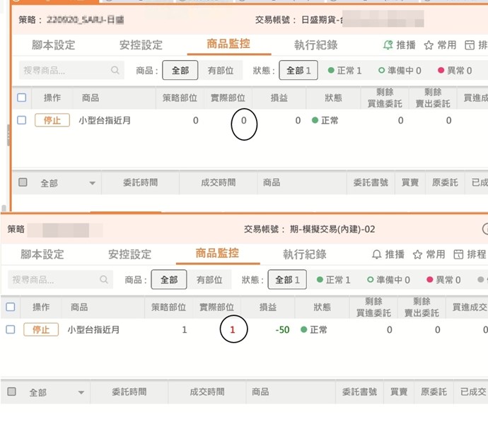 下圖,同一個腳本,但兩個策略中,跑日盛的給我反覆進出了三次,而模擬帳號是正常的僅按訊號下單一次。