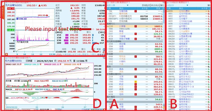 如下圖所示 欄框1跟2 是商品盤勢以及技術線圖,而欄框3跟4 是自選股