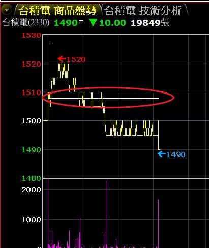 如果江波圖主圖刻度選自動這種會隨高低點變化的座標的話 在刻度改變時主圖的指標不會跟著變動的刻度變化 以台積電的開盤價1510畫線為例 上面的白線是開盤價 但是如果用主圖指標的話當價格創高創低左邊刻度變化時主圖指標就會跑掉(如紅圈處)