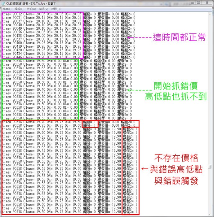 今天大盤不太好,難得有篩選到不錯的標的做買賣,但又發生多起不存在價格事件,導致該觸發而沒觸發,錯失賺錢契機;盤後常感嘆,以前是進出場策略寫不好常賠錢,現在策略腳本會寫了也會校正了卻是報價錯亂而賠錢或賺不到錢,害的現在我每天開盤前都猶豫是否要啟用下單,不開怕錯失行情,開了又怕給你亂買亂賣導致非技術性虧損,著實是兩難。