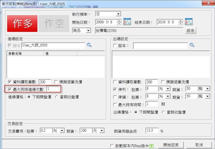 要如何設定,才能只跑開盤符合條件那一筆(只進場一次),之後即使符合條件都不要跑進回測的結果裡了?????