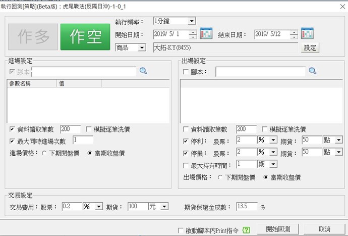 若我以下列條件進場放空,跑的頻率為1分K,停損停利都設2%,來進行回測: