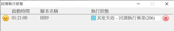 如果您遇到的狀況也是 回測執行異常206 的話,麻煩您提供腳本以及回測的相關設定(截圖)來協助工程師檢驗。