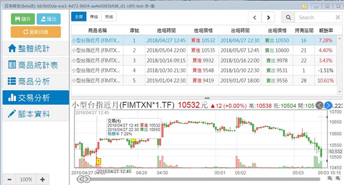 您好,您在 2019/05/13 附上的回測報告檔案(回測報告畫面如最下圖,看起來是沒問題的)