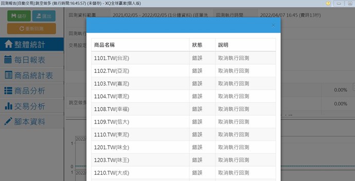 今天回測, 有時執行到最後1%錯誤, 大部份時間直接出現"取消執行回測"這個錯誤!