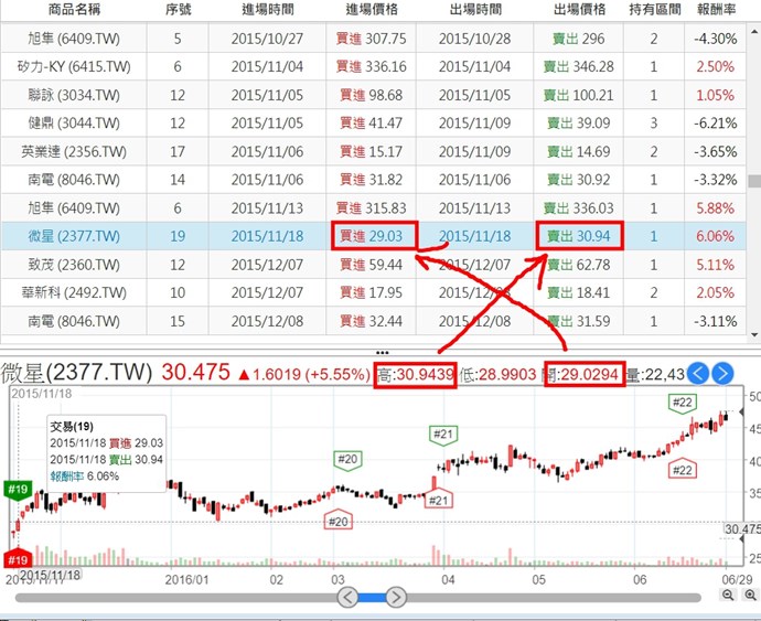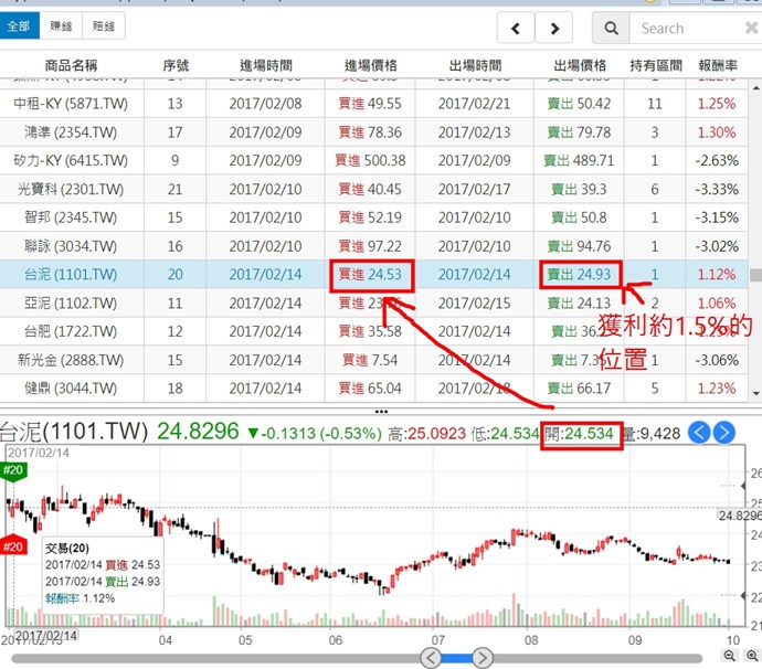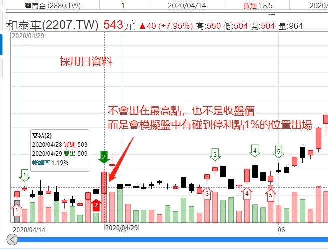 另外,當採用"日"頻率回測時,會去模擬是否有到停利或停損點,在附近的點位出場,