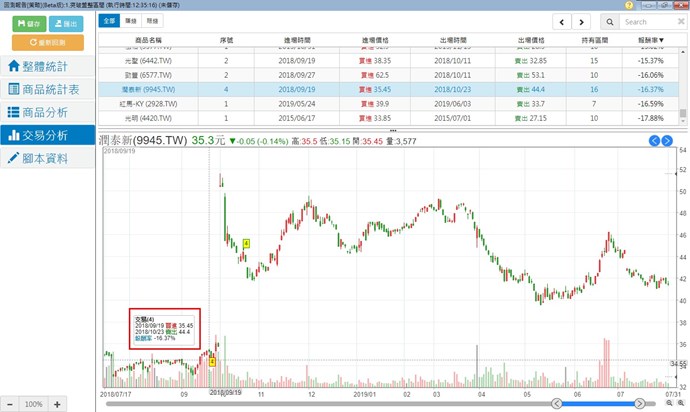 請問有關回測的數字好像有問題,如圖示買進35.45賣出44.4應該為正報酬,但顯示出來為負的,跑很多種程式,很多負報酬的都有這樣的問題