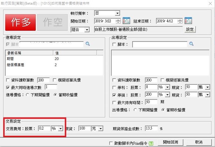 2.在回測上,有一個交易設定的交易費用欄位,預設為股票0.2%,您可以將手續費&交易稅一起納入計算