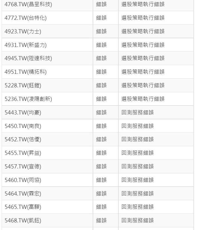 在回測時,回測失敗的商品說明有分"選股策略執行錯誤"與"回測服務錯誤"