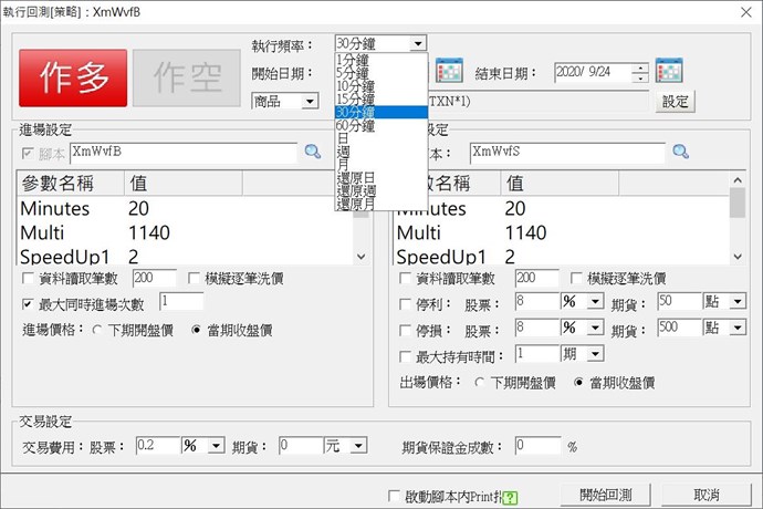 在平常使用的主圖那邊可以選擇資料頻率為20分鐘的, 在回測功能卻沒有這種選項, 如此不一致的現象, 都沒有要解決嗎? 都已經做了其他5分. 10分....等的選項, 加一項很難嗎? 公司寫的回測用系統程式應該很有彈性吧? 猜測該是傳進不同的分鐘參數去回測用系統程式而已
