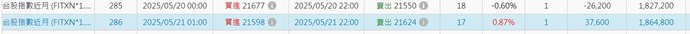 5/21是5月份合約的最後交易日,損益會將五月結算的損益加上六月份合約的平倉損益。回測時的損益計算是,5月舊倉在結算價出場、同時6月新倉在結算價進場。
