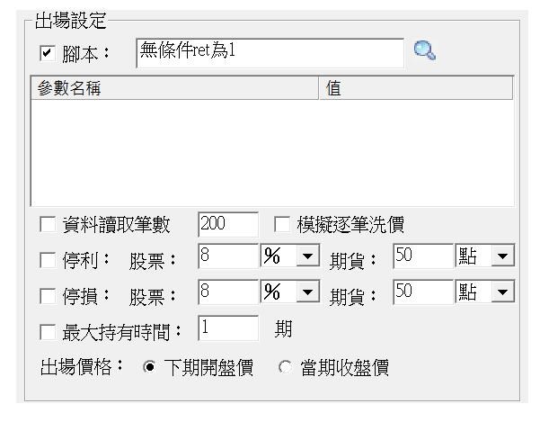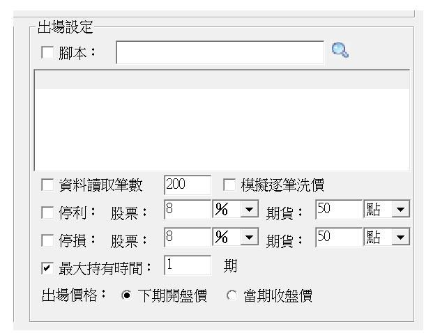 1.出場腳本沒挑 但有勾最大出場時間為1+出場價格下期開盤價(如下圖)