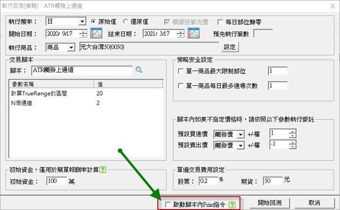 A:謝謝您的回饋,建議您可以使用 Print 語法,撰寫在回測腳本中,回測時記得勾選「啟動腳本內Print指令」例如以下範例語法,這樣回測時就能產生這些數值檔案,方便您檢視數值,以上說明,謝謝。