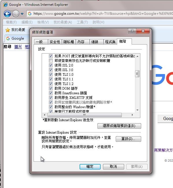 (2) 跳出的視窗 先點選上方的"進階"-->安全性-->TLS1.1 或TLS1.2需打勾