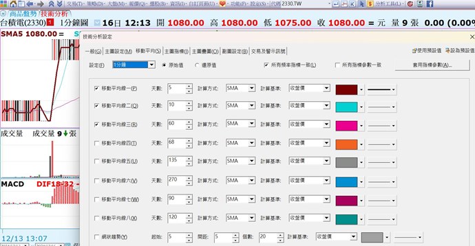 請問如何在走勢圖中顯示簡單移動平均線5MA、10MA、60MA...等,謝謝