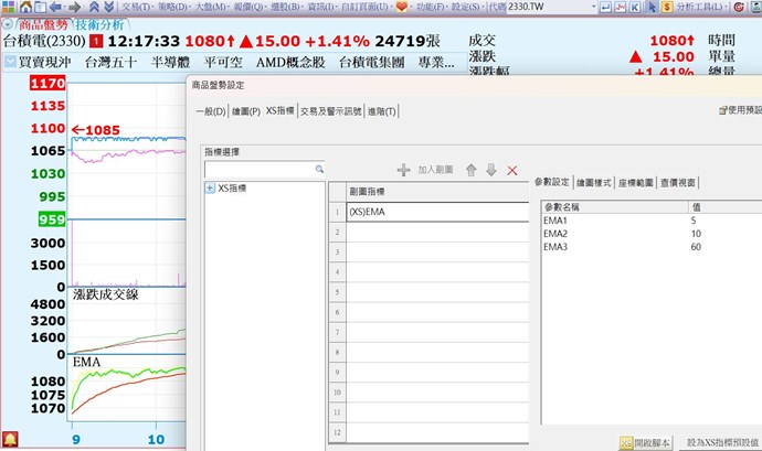 1.可以在商品盤勢頁面上按「右鍵/XS指標設定」,並設定「EMA」指標(可自行設定參數值),目前該設定不會疊在主圖上,會是副圖指標(此功能有列入優化內容,排入後續更新改善)。