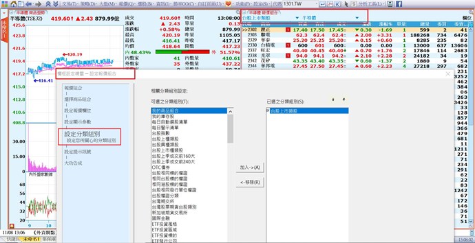您好,類股報價組合清單請使用自訂頁面的「報價組合」,並可設定分組類別。