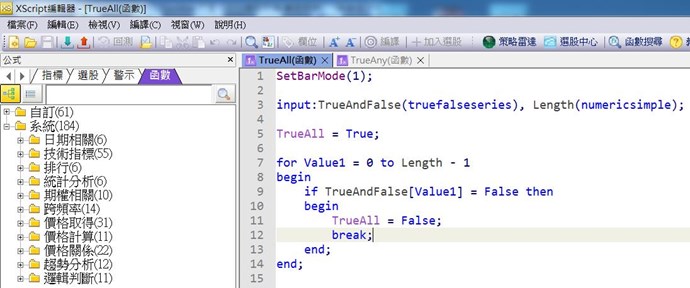 您好,您可以查看 Trueany、Trueall 的系統函數腳本,有相關的範例可供參考,