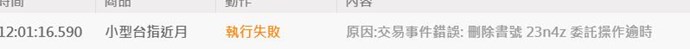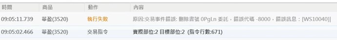 執行狀態顯示 執行失敗 原因:交易事件錯誤:刪除書號0PgLn委託,錯誤代碼-8000,錯誤訊息:[WS10040]