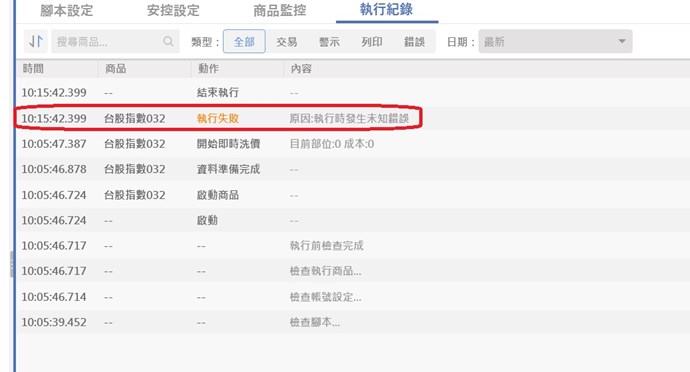 今天早上遇到幾次 "執行失敗 原因:執行時發生未知錯誤". 我同時有4個策略在跑,每個策略在同一個時間點都停了.