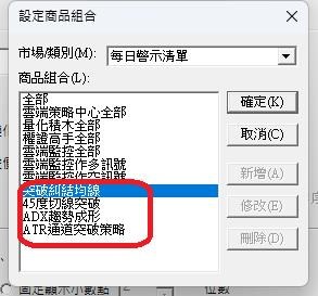 設定商品組合時,市場/類別選擇每日警示清單,若策略雷達中有啟動的策略就會顯示在下面的視窗中,按確定按鈕之後,就可在報價組合的每日警示清單視窗看到這些策略。