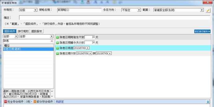 在內建選股條件中,也有以上三個除權息日期相關內建選股條件可使用,請輸入關鍵字搜尋,如下圖,