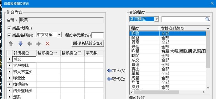 您好,目前報價欄位沒有支援顯示技術分析指標值。