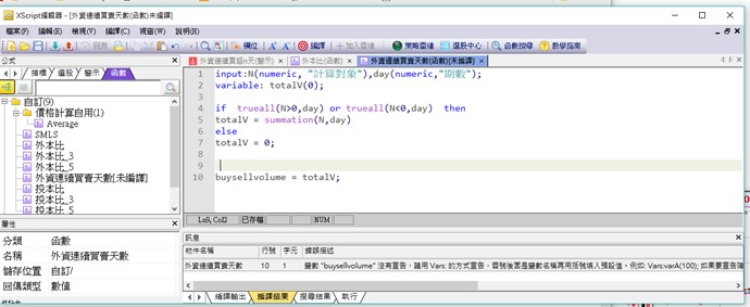 外資連續買賣天數101變數 "buysellvolume" 沒有宣告,請用 Vars: 的方式宣告,冒號後面是變數名稱再用括號填入預設值。例如: Vars:varA(100); 如果要宣告陣列請用 Arrays: 冒號後面是名稱再用 [] 設定維度與大小,括號填入預設值。例如 Arrays:arr1[10](0);。