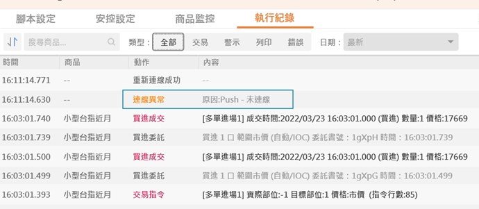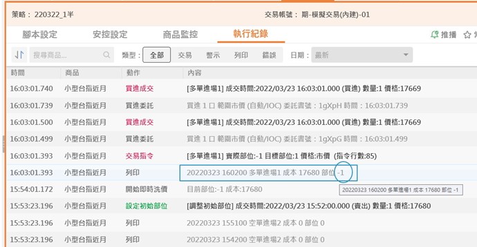 問題1 : 我下圖與下列語法的多單進場,理論上多單應是部位要是1,但印出來的卻是 -1 呢?還有print成本FilledAvgPrice是17680,也是與實際上下單成功的成本17669不同,落差差滿多的,見下圖。