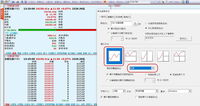 您好,可以設定自訂頁面類似下圖,左上欄框是「商品盤勢-報價」,左下欄框是「商品盤勢-明細」,並看是否要設定為同步。