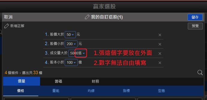5.【贏家選股】缺失,1.「張」字要放在外面 2.數字無法自由填寫