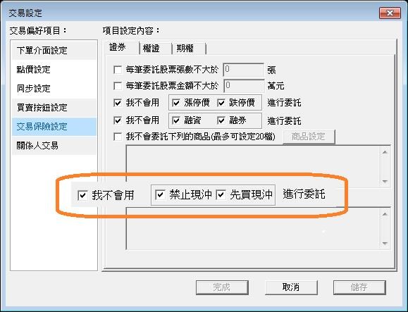 3.【交易保險設定】增加 2 項勾選,「我不會用﹝禁止現沖、先買現沖﹞進行委託」