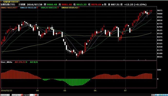將 AO指標大於0的部分 畫成紅色柱狀圖,