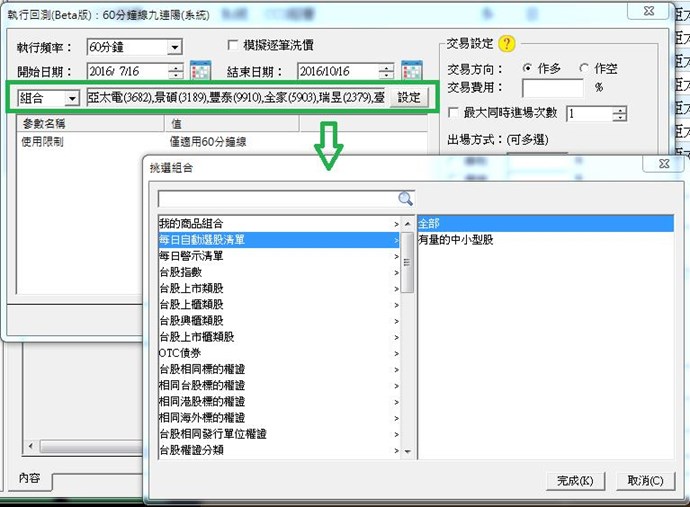 再至您的策略回測,選擇該每日自動選股清單作為回測商品,