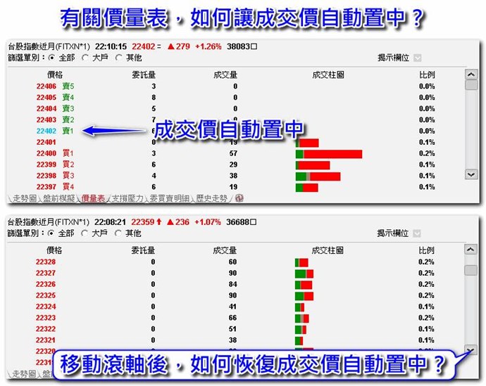 XQ執行後,價量表的成交價會自動置中,但在移動滾軸後,如何恢復成交價自動置中?(附件圖示是問題說明)