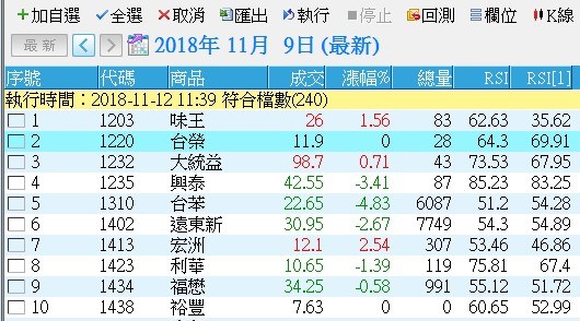 下圖是月RSI大於50,且董監持股佔股本比例少於10(%)的選股清單,
