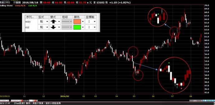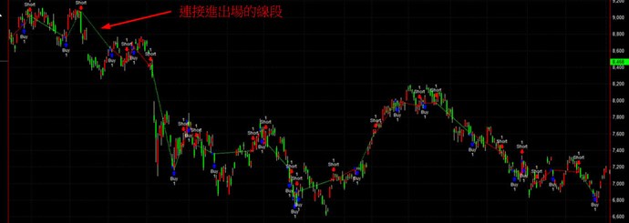 另有一問,, 只是用箭號表達進出手法還是太粗糙,,如果能在進出場點用線段連起來, 更能直觀看出當筆進出場點位,,如下圖, 目前是否有函數可以畫出如圖中趨勢線的線段